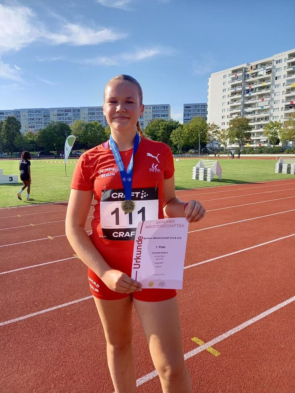 Erfolgreichste Athleten des Tages und Goldmedailliengewinner sind Charlotte Dietrich und Malik Hauck (VfB Hermsdorf). Im Kugelstoß wird Charlotte mit einer neuen PB von 9,32m deutlich Berliner Meisterin!