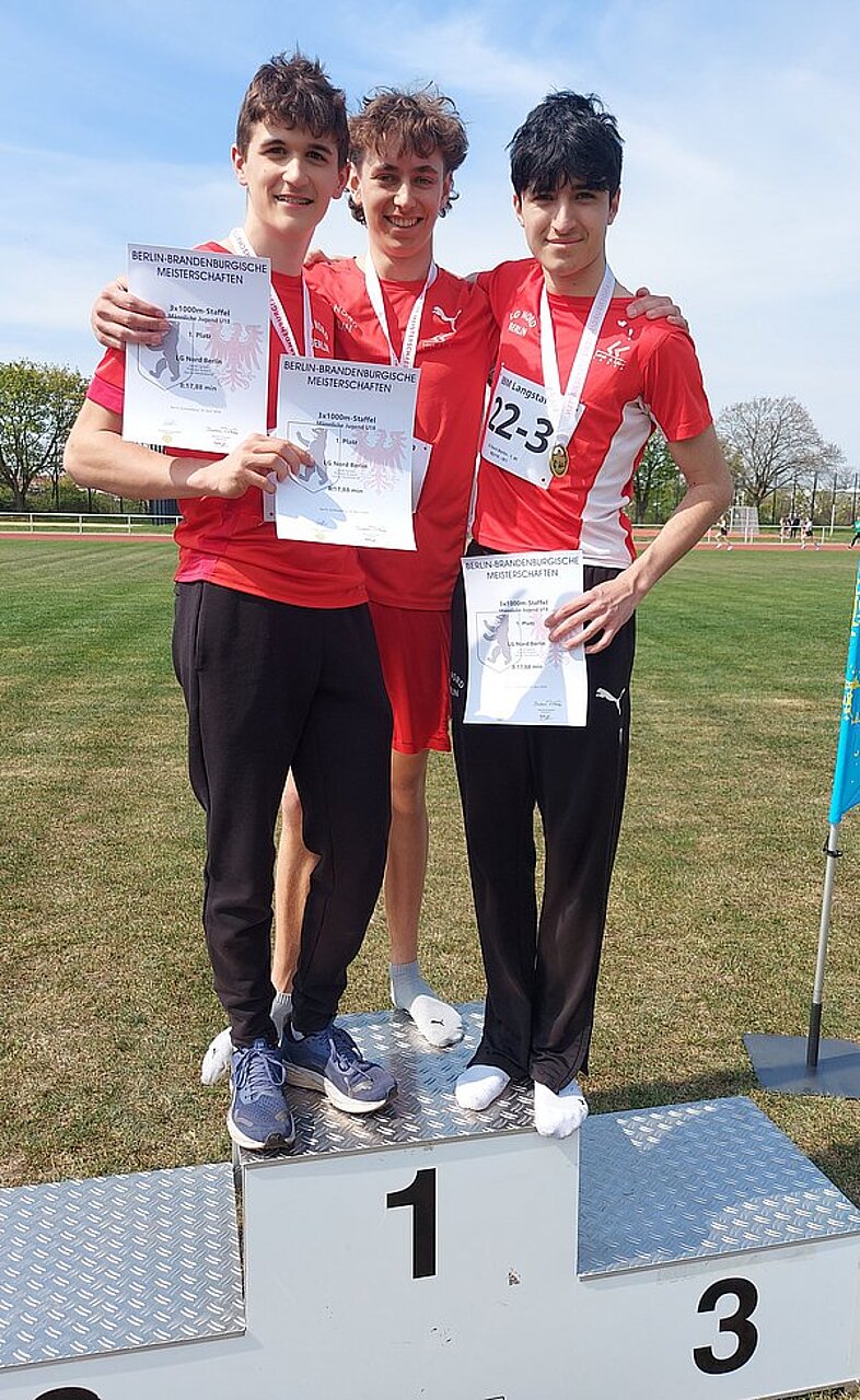 Im Wettbewerb der Männlichen Jugend U18 errangen unsere Nachwuchsläufer Jakob Lankes, Theodor Kubsch und Jascha Heisterkamp über 3x1000m den Titel. Nach 8:17,85min erreichten sie unangefochten das Ziel. Erfreulich war auch die Silbermedaille für das Team der Weiblichen Jugend U20 über 3x800m mit Julia Fröhlich, Hermine Tonch und Antonia Eschenbrenner, das gute 7:27,96min lief. Beide Staffeln erreichten damt die DM-Norm!