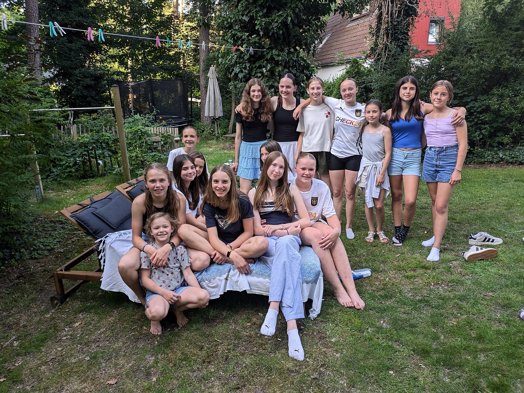 Die Wettkämpferinnen der U14 mit den erfolgreichen Mädchen vom SC Tegeler Forst und dem VfB Hermdorf trafen sich am vorletzten Trainingstag nicht in den Stadien, sondern im Garten von Familie Freudenberger in Frohnau. Gemeinsam mit zahlreichen Eltern gab es Gegrilltes, Salate und Kuchen sowie ausreichend Getränke für diesen warmen Sommerabend, der auch dem Zusammenhalt der Gruppe und beider LG-Vereine diente. Die Mädchen genossen das Grillfest fast bis zum Sonnenuntergang und die Eltern hatten zahlreiche Gepräche rund um die Leichtathletik und zum tieferen persönlichen Kennenlernen.