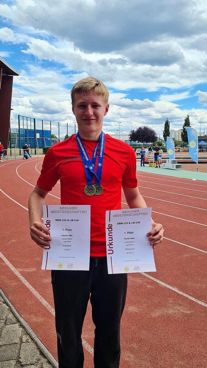 In der AK M14 gelang Florian Abel ein Doppelsieg: Mit 12,50m gewann er den Kugelstoßwettbewerb und auch im Diskuswurf konnte er mit 37,07m die Goldmedaille gewinnen. Seine weiteren Ergebnisse können sich ebenfalls sehen lassen: Platz 5 im 100m Sprint mit 12,15s (+2,1 Rw), Platz 4 im 80m Hürdensprint mit 12,71s (VL 12,04s). Als Mitglied der 4x100m Staffel kam er zusammen mit Tamo Krumrey, Luis Twele und Titus Lehmann in guten 46,69s auf den Silberrang und wurde somit erfolgreichster Nord Athlet bei diesen Titelkämpfen.