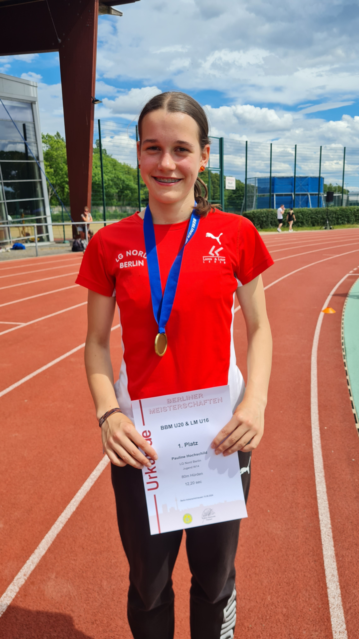 Im 80m Hürdensprint konnte sich Pauline die Goldmedaille sichern. Ihre hier aufgestellte neue pB von sehr guten 12,20s lief sie bei gültigem Rw.